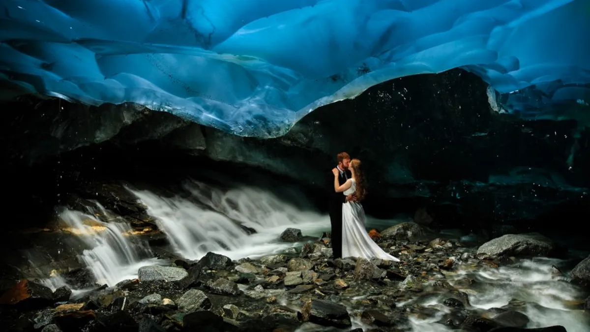 Las cuevas de hielo de Mendenhall, en Alaska, constituyen una aventura romántica perfecta para las parejas a las que les gusta enfrentarse a un poco de peligro. Las cuevas brillan con un azul impresionante que los visitantes suelen describir como «de otro mundo».