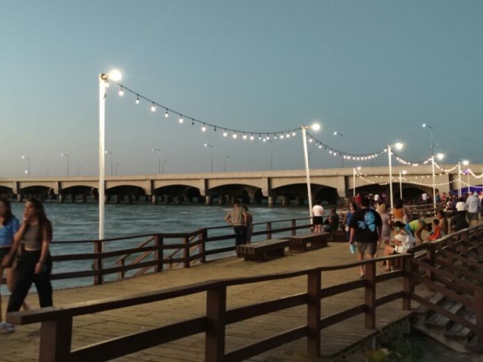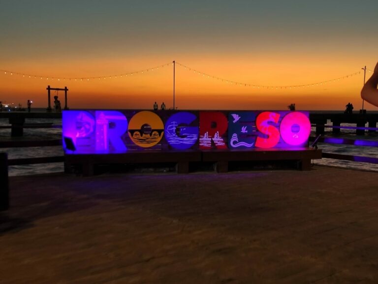 Este tramo que atravisa hasta llegar al muelle de pescadores se le conoce como “El Deck” un espacio que alberga algunos establecimientos de comida, hay mesas y sillas y un “camastro” con las letras coloridas de PROGRESO.