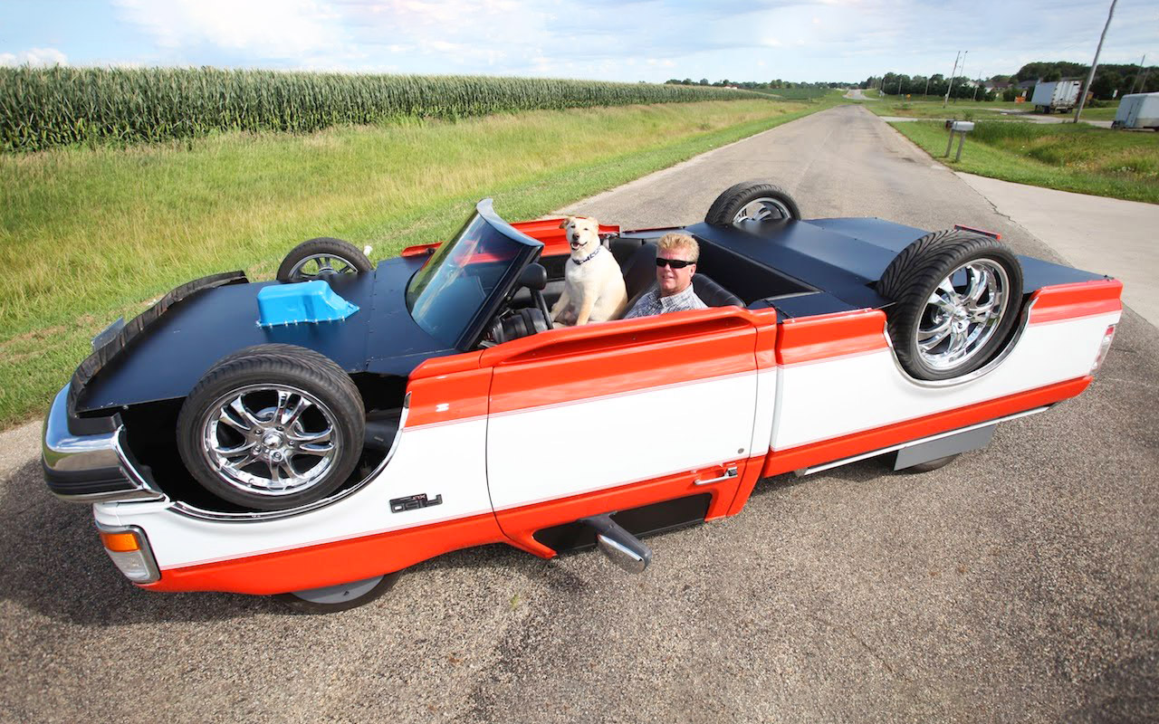 Rick Sullivan es propietario de un centro de colisiones en Illinois. Después de ver un auto volteado, se le ocurrió la idea de este mod personalizado. Utilizó un Ford Ranger del 1991 y un F-150 de 1995, además de cuatro ruedas adicionales en el aire para el vehículo al revés.